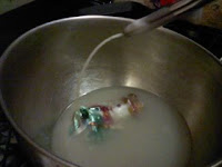 Begin by filling your pot with water, and put it on the stove on high. immediately put your metal bowl on top and don't touch it ever again (its gets HOT quickly). Place your candle in and wait patiently while it melts... this could take a while.